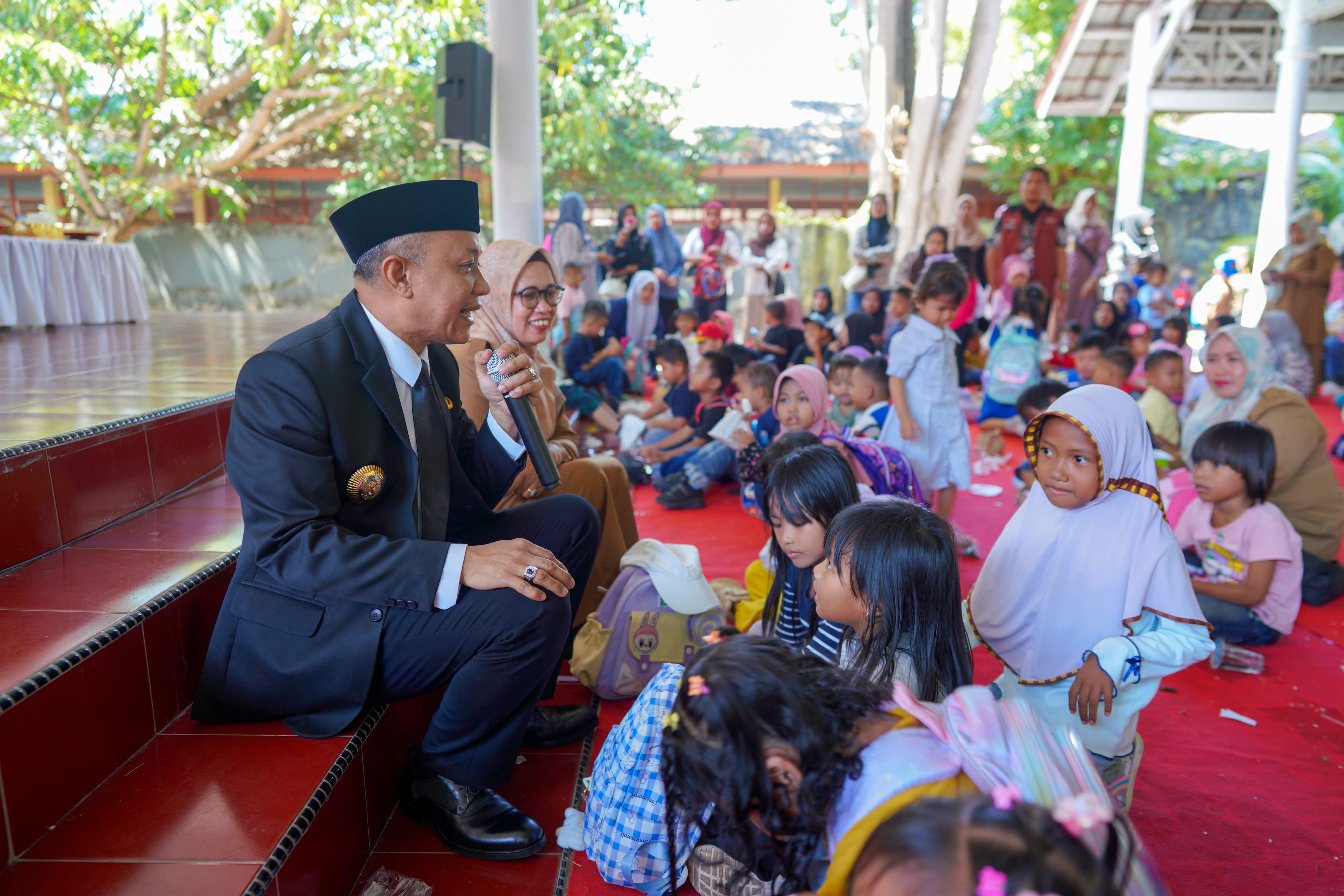 Bupati Kepulauan Selayar, H. Muhammad Natsir Ali, bersama Wakil Bupati, H. Muhtar, berbaur dengan anak-anak Taman Kanak-kanak dalam suasana penuh keceriaan. Kegiatan ini dibuka secara daring oleh Gubernur Sulawesi Selatan, Andi Sudirman Sulaiman.
